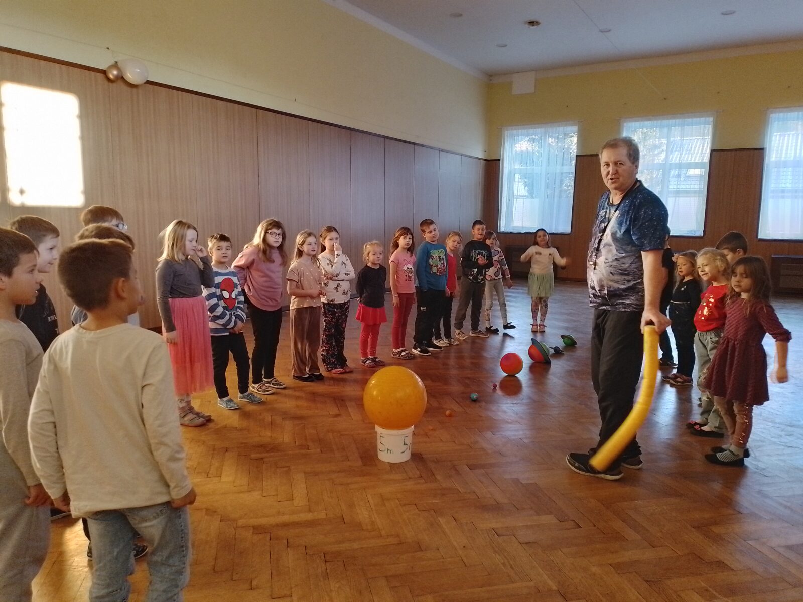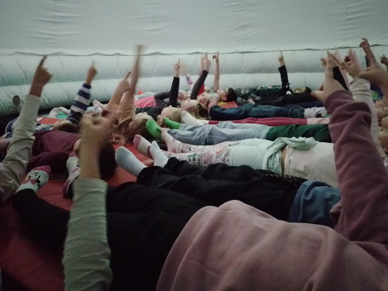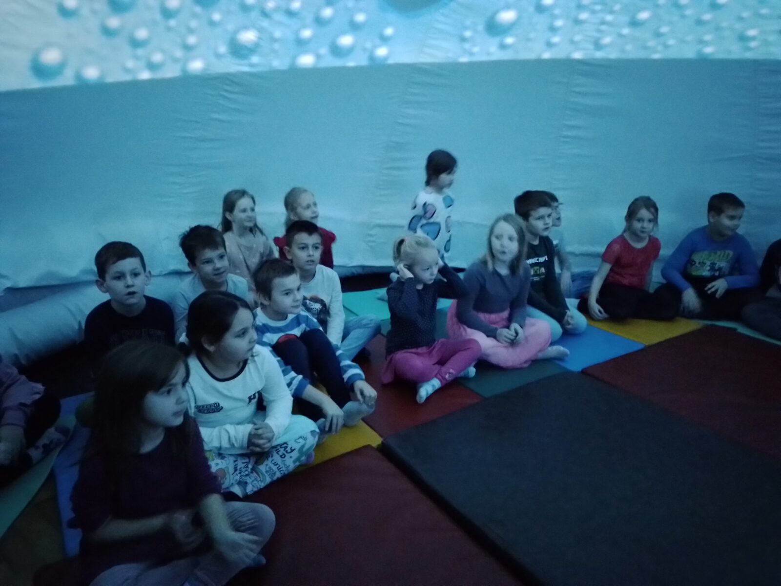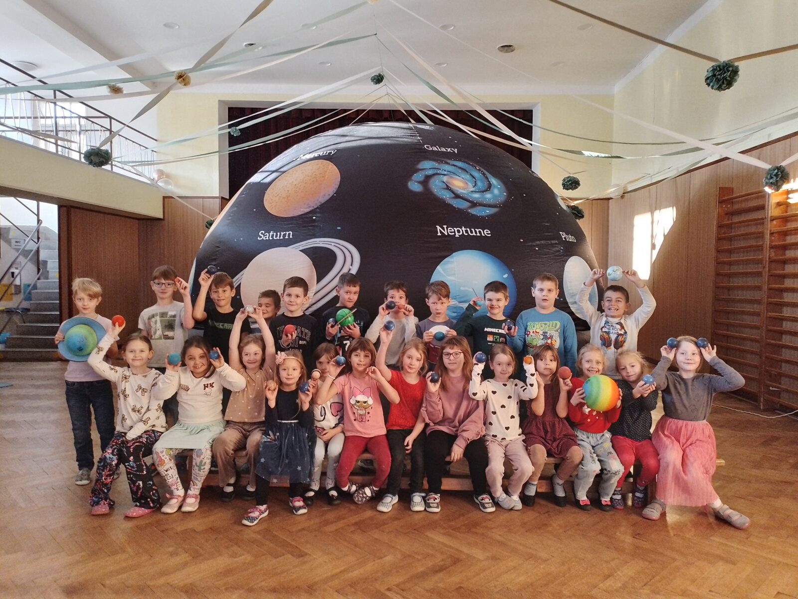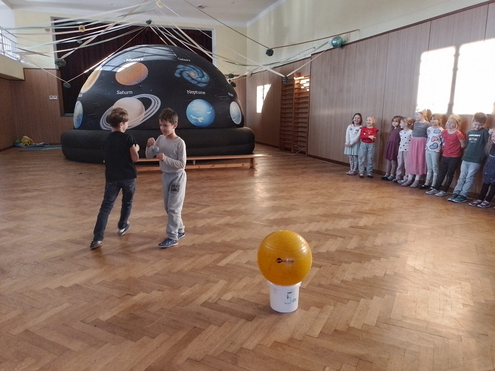 Ve středu 19. 11. se děti z Koťátek a žáci ZŠ vydali na Sokolku, kde pro ně byl připraven speciální Kosmický stan s programem o vesmíru. Malí kosmonauti nastoupili do vzduchem podpírané kopule a dozvídali se zajímavé věci o vesmíru a Sluneční soustavě. Následovala pohybová část programu, při které se děti samy staly kosmickými tělesy a svým pohybem simulovaly například oběhy Země a dalších planet kolem Slunce, oběhy Měsíce kolem Země, nebo třeba oběhy devadesáti měsíců kolem Jupitera. Za odměnu děti dostaly vesmírné lušťovky a mohly si půjčit puzzle s vesmírnými motivy. Jak se program žákům líbil a co si zapamatovali, si můžete přečíst v písemných pracích žáků 4. ročníku.