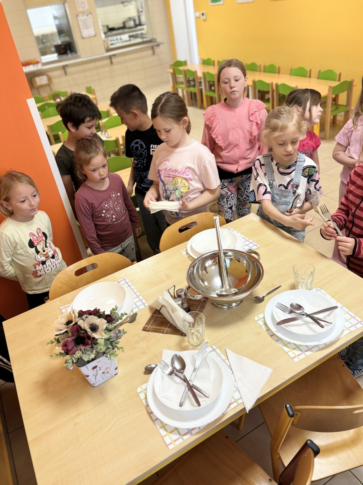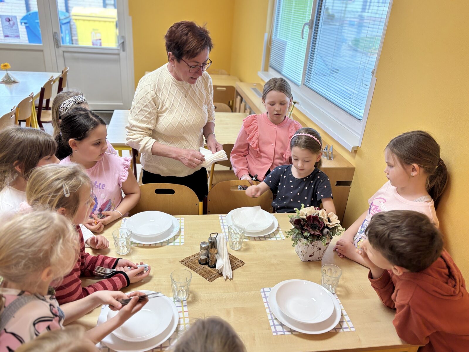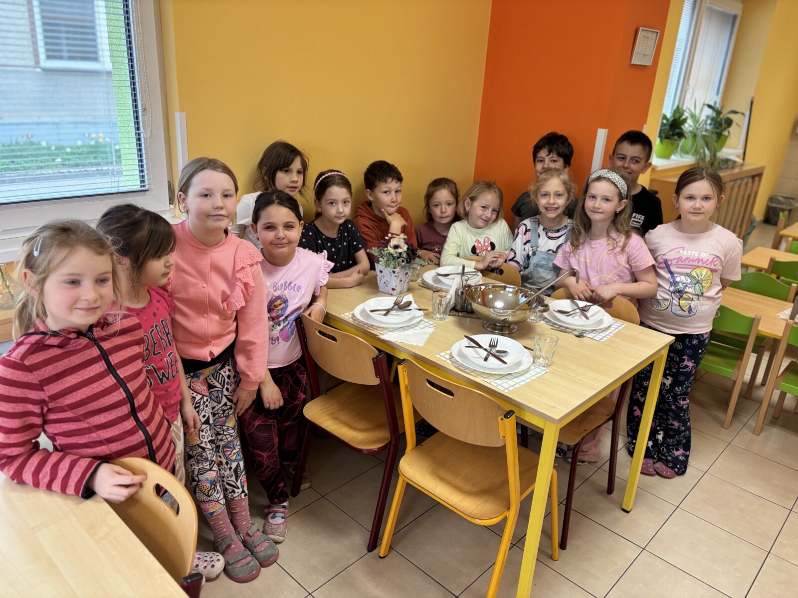 Prvňáčci využili prostory školní jídelny, aby si potrénovali pravidla stolování. Učili se připravit správně příbory, složit ubrousek, pojmenovat různé druhy talířů a naaranžovat stůl ke svátečnímu obědu. Děti byly šikovné a vše rychle pochopily, věříme tedy, že i doma zvládnou pomoci, až bude třeba.