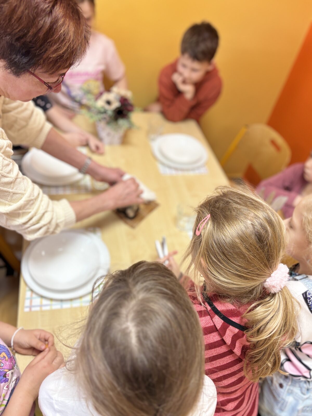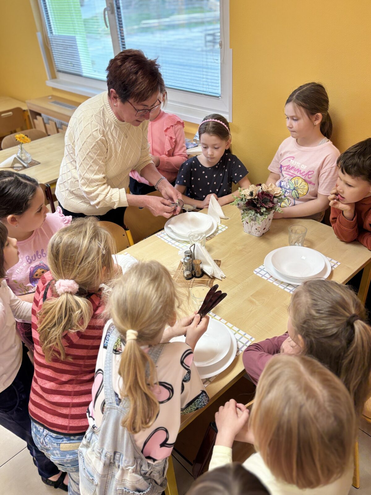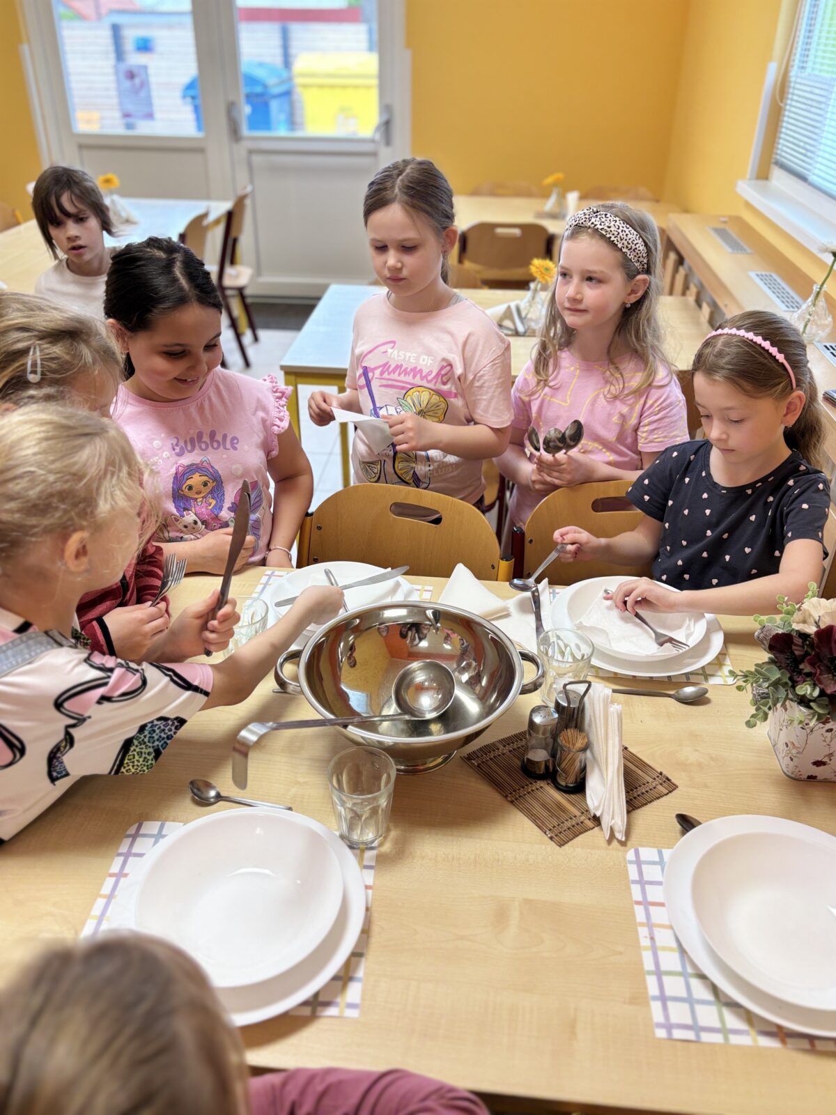 Prvňáčci využili prostory školní jídelny, aby si potrénovali pravidla stolování. Učili se připravit správně příbory, složit ubrousek, pojmenovat různé druhy talířů a naaranžovat stůl ke svátečnímu obědu. Děti byly šikovné a vše rychle pochopily, věříme tedy, že i doma zvládnou pomoci, až bude třeba.