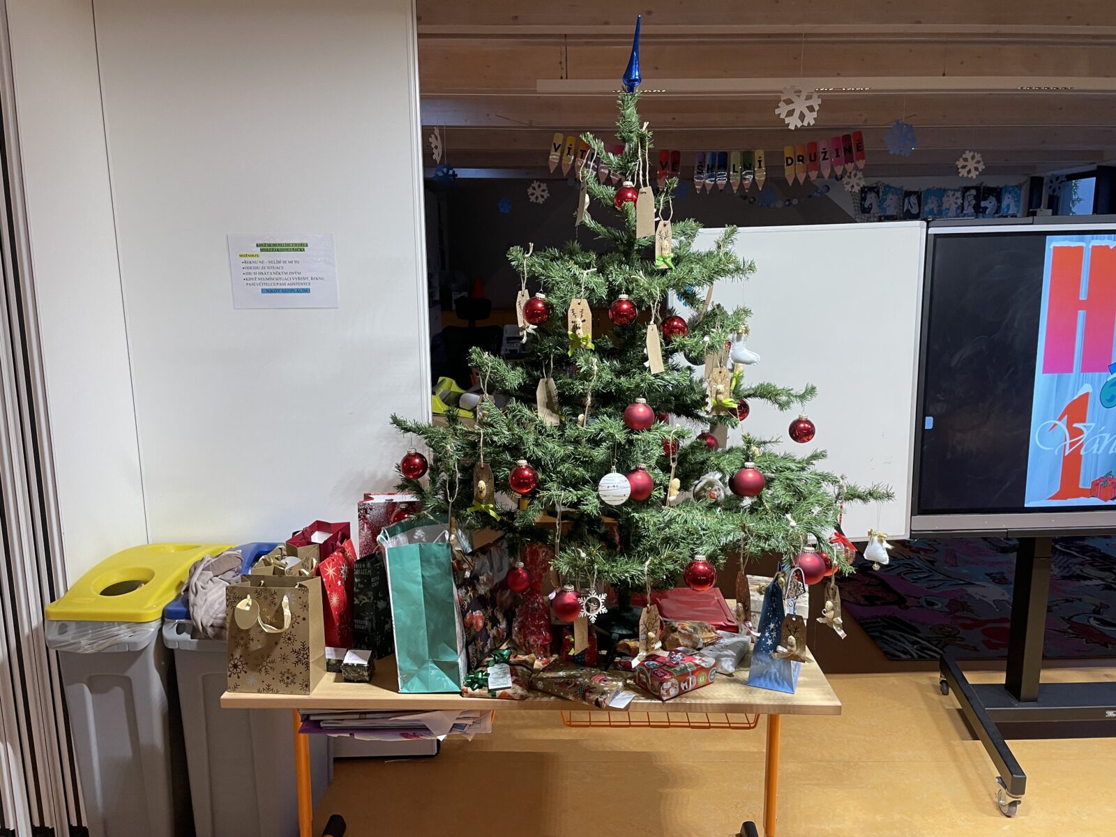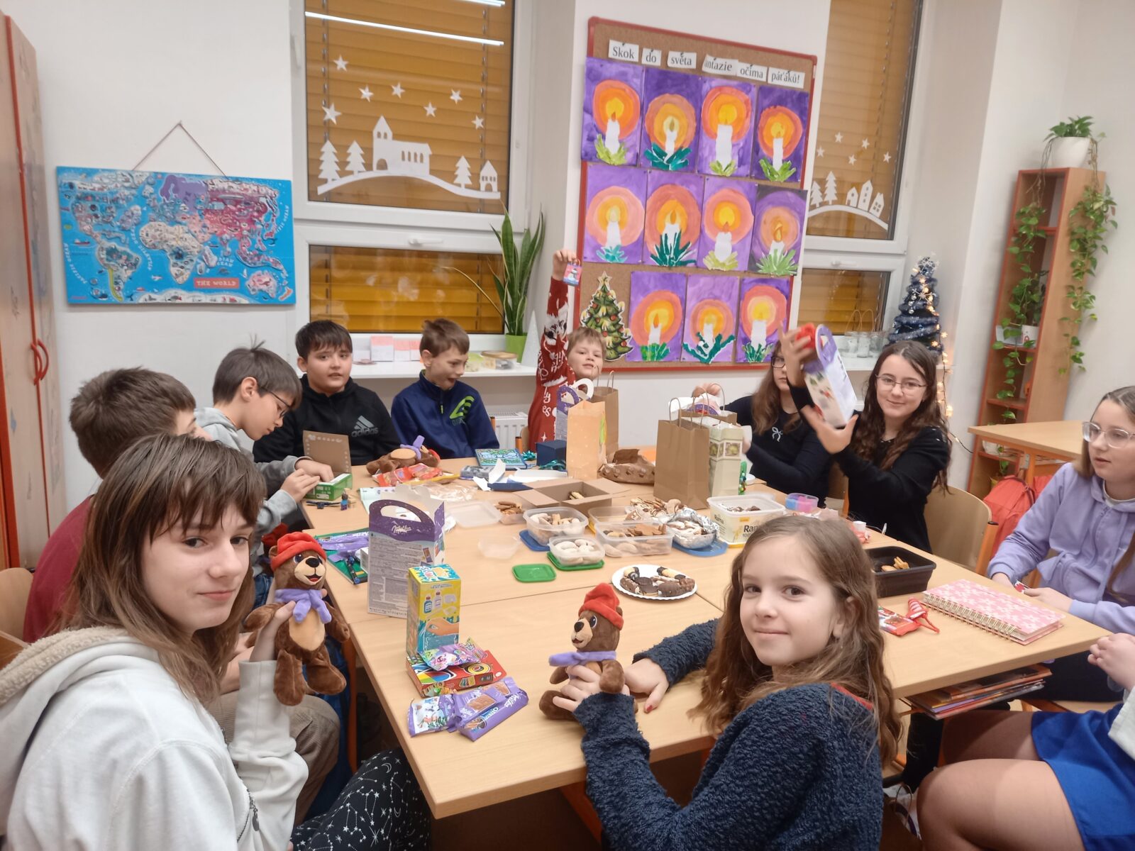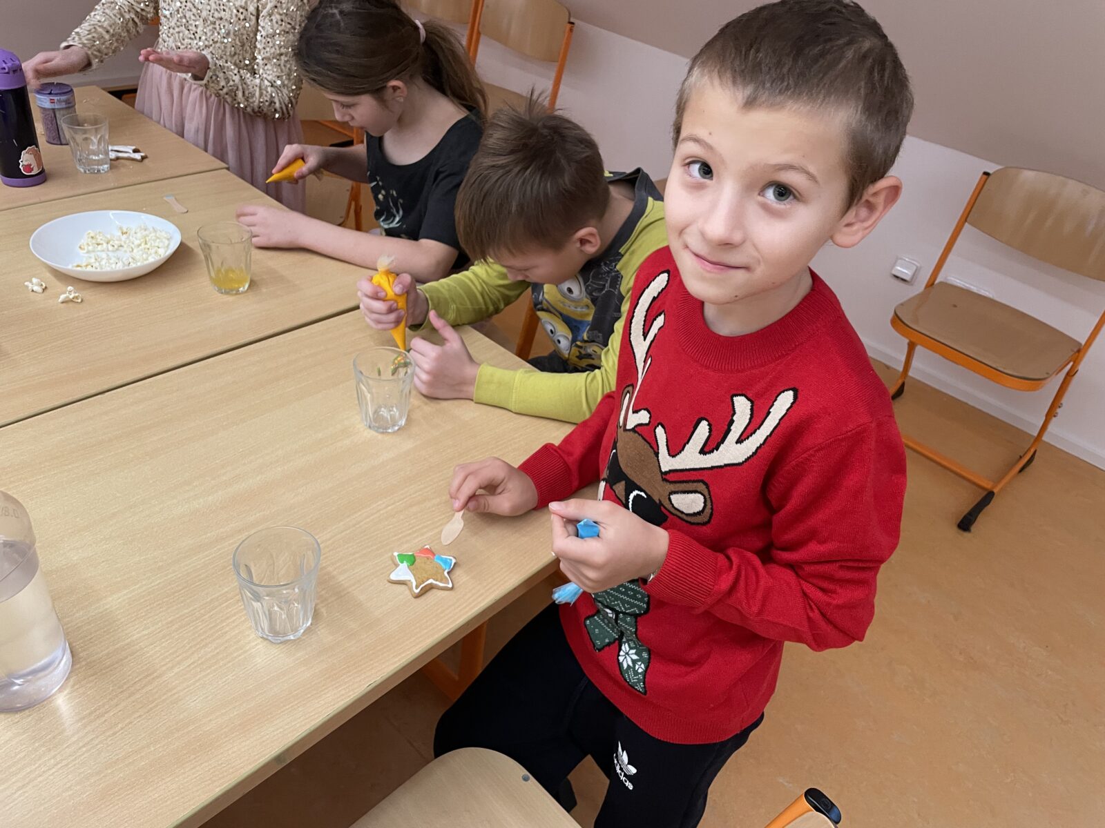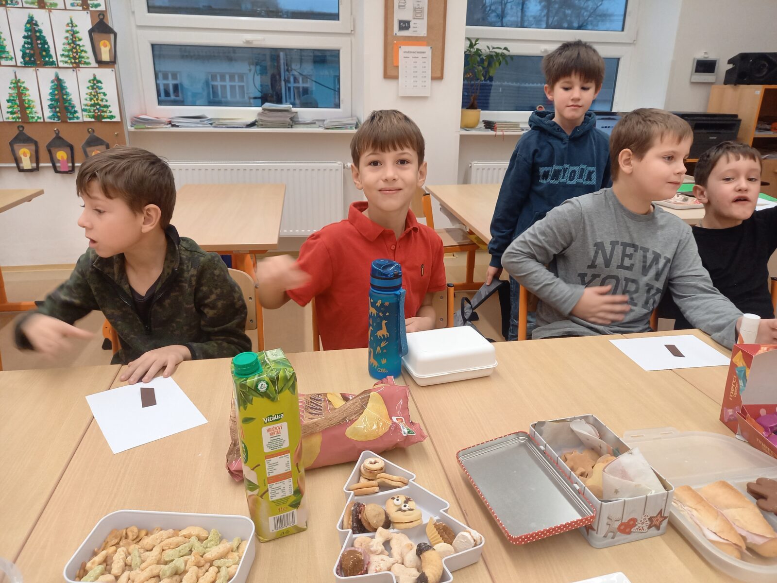 Poslední den před Vánocemi vládla ve škole uvolněná atmosféra. Dospělí i děti nemohli utajit vánoční těšení. Každá třída si na tento den připravila program, stromeček a dárečky pro spolužáky. Děti si vytvořily občerstvení – přinesly vánoční cukroví i něco na zapití, poznávaly vánoční zvyky, v každé třídě se vyráběl nějaký výrobek. Následovalo rozbalování dárečků, koledy nebo pohádka. Zvláště zajímavé tvoření proběhlo ve 4. třídě, kde obětavá maminka paní Vránová pomohla s napečením perníčků a celá třída tak mohla zdobit podle svých představ. Poslední den ve škole v roce 2025 jsme si užili také díky výbornému obědu od paní kuchařky – k radosti dětí byla pizza. Těšíme se na shledanou v roce 2026!